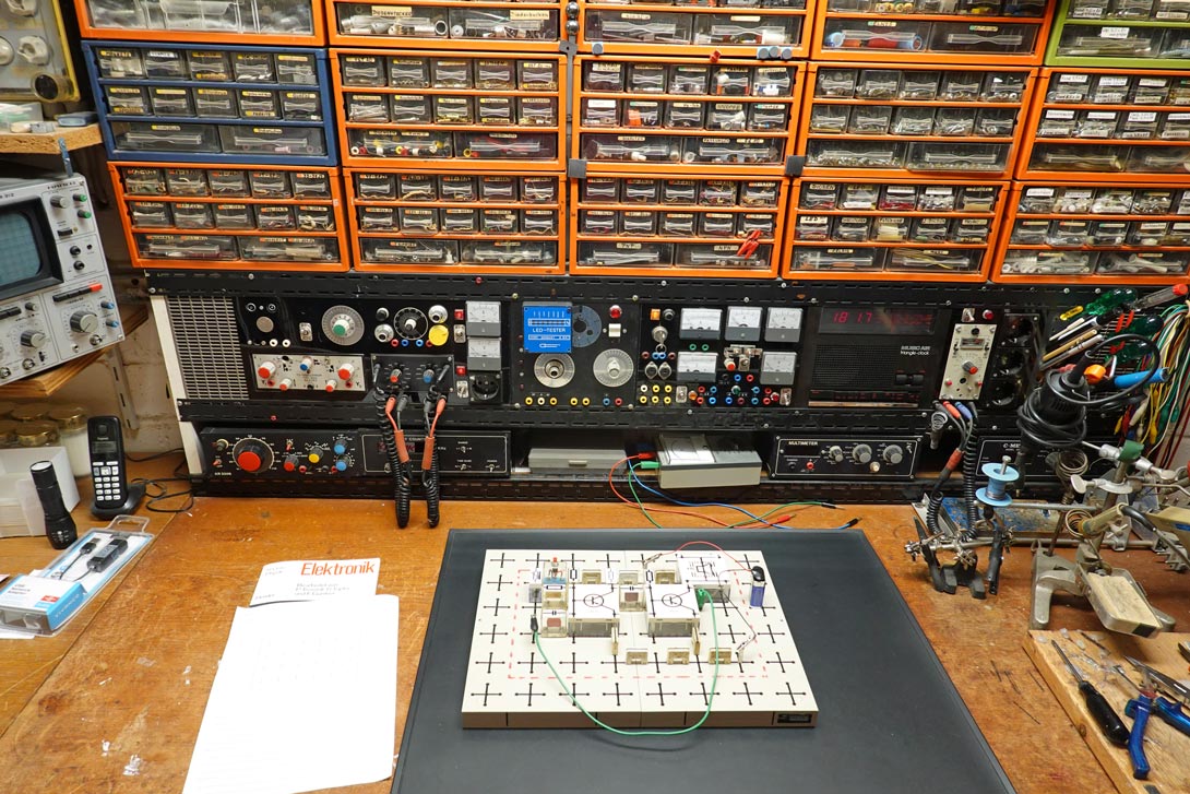 Zur Elektronik kam ich über die Elektrizitätslehre , die ich als junger Lehrer in der Hauptschule im Physikunterricht behandelte. Da ich die Schüler unbedingt zum Experimentieren bringen wollte, fehlte das entsprechende Experimentiermaterial, denn es war in der Schule nur ein Demonstrationssatz der Firma PHYWE vorhanden. So fertigte ich kleine Bausteine aus Holz und später aus Plexiglas an, mit denen man Stromkreise aufbauen und verschiedene Bauelemte in diesen einbauen konnte. Als Stromversorgung diente eine einfache 4,5 Volt Taschenlampenbatterie. So konnten die Schüler mit Schaltern, Tastern, Widerständen, kleinen Lämpchen, Minimotoren und Feinsicherungen alle elektrischen Grundlagen viel leichter erlernen. Vor allen Dingen waren alle bei der Sache und hatten Spaß daran. Mein oberstes Motto als Lehrer war immer: Physikunterricht muss Spaß machen! Bei der Fernmeldezeugstelle in Düsseldorf gab es für Fernmeldetechniker alles kostenlos, was man haben wollte. Ein Freund gab mir den Tip und die notwendigen Antworten, wenn ich gefragt wurde, an welcher Dienststelle ich arbeitete und wofür ich die Geräte brauchte. So konnte ich mit meinen Schülern eine interne Telefonzentrale aufbauen und alle verstanden das Wählverfahren. Mit den Relais, Tastern und Wählscheiben bauten wir lustige Schaltungen.