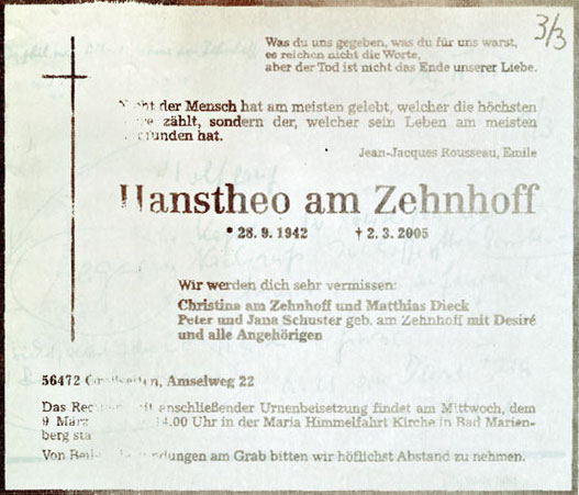 In der Zwischenzeit waren jedoch einige Ereignisse eingetreten, die wir nicht erwartet hatten. Es begann mit dem Tod von Hanstheo am Zehnhoff, der überraschend am 2. März 2005 im Alter von 62 Jahren starb. Nach seiner Beerdigung hatte ich nur ein Fax von seinem Bruder Albert an Wolfgang Kreutzer bekommen, der an der Beerdigung teilgenommen hatte. Hanstheo hatte 27 Jahre lang die Realschule am Erlenweg in Bad Marienberg geleitet und war dann an einem Krebsleiden gestorben. Die Schule hat das sehr getroffen, denn er war sehr beliebt bei den Schülerinnen und Schülern wegen seiner einfühlsamen und freundlichen Art, die wir ja auch aus unserer gemeinsamen Schulzeit am Quirinusgymnasium kannten. In gleicher Weise waren die Eltern zutiefst erschüttert, die seinen Humor und seine menschliche Halltung sehr geschätzt hatten.