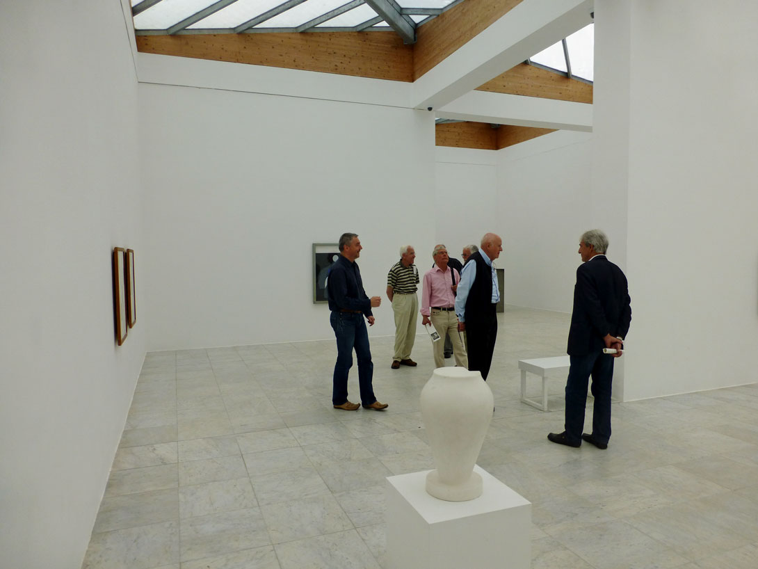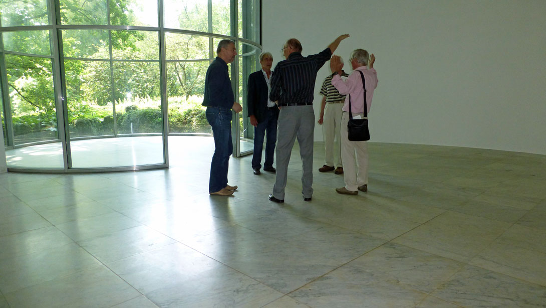Nun mag natürlich eine Rolle gespielt haben, dass einige Straßen in der Innenstadt wegen des Freundschaftstages der Kulturen gesperrt waren. Besonders Martin-Walter Ruf hatte darunter zu leiden. Der hatte nämlich im Hamtorhotel übernachtet und sein Fahrzeug dort auf dem Parkplatz stehen. Und da er sich auf sein Navi verlassen hatte, in das er die Adresse vom Museum Insel Hombroich eingetippt hatte, war er verlassen. Das wies ihn nämlich stur an, die abgesperrten Straßen zu fahren, was ihn einige Runden kostete. Immerhin schaffte er es bis kurz vor 12:30 Uhr, als unser Museumsführer, Herr Stittgen, nicht mehr länger warten wollte und schon mit der kleinen Gruppe losgezogen war.